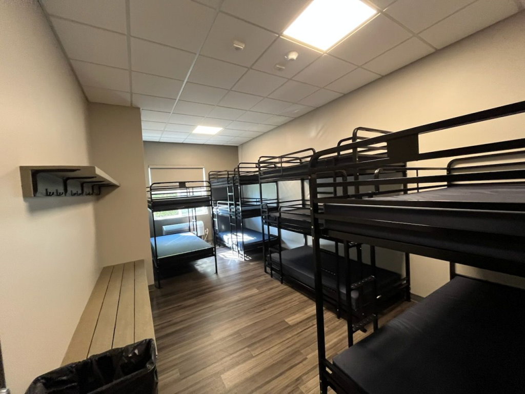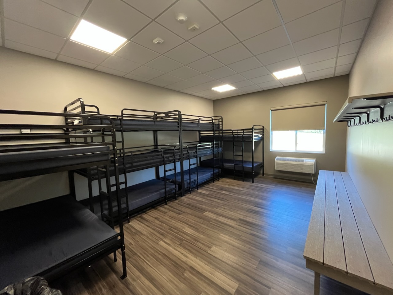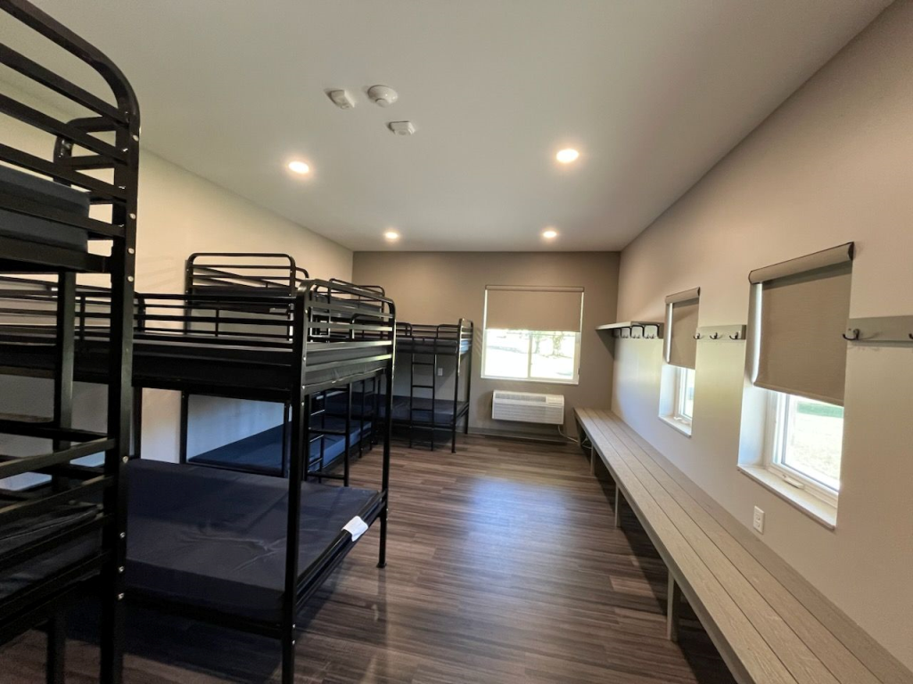 Type: Dorm Room Count: 8 Rooms Occupancy: 80 Guests Format: 8 dorm style rooms with 2 triple bunks and 2 double bunks. 1 ADA accessible public bathroom, 2 large multi use public bathrooms in the building at the end of the hall. Heat and AC.